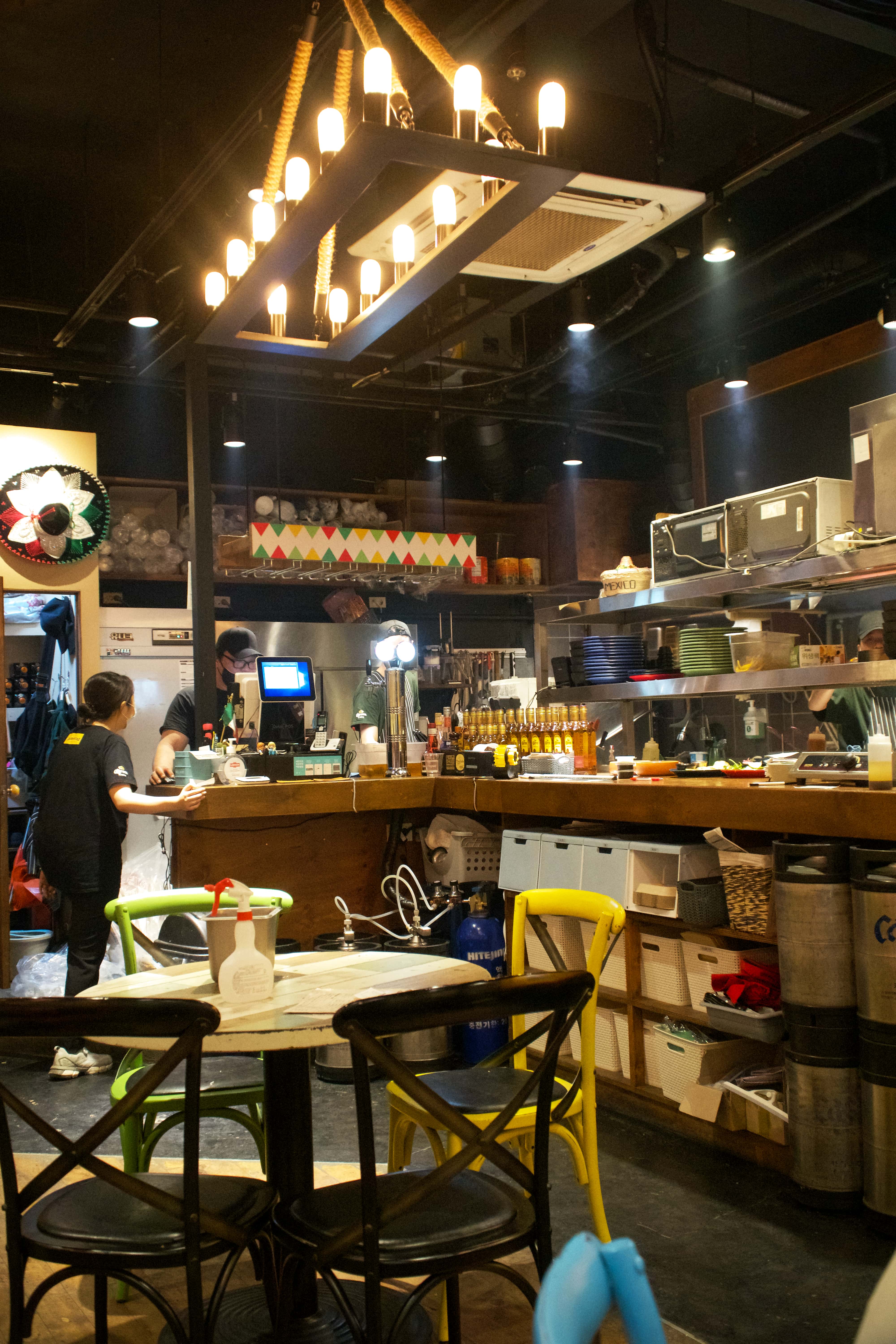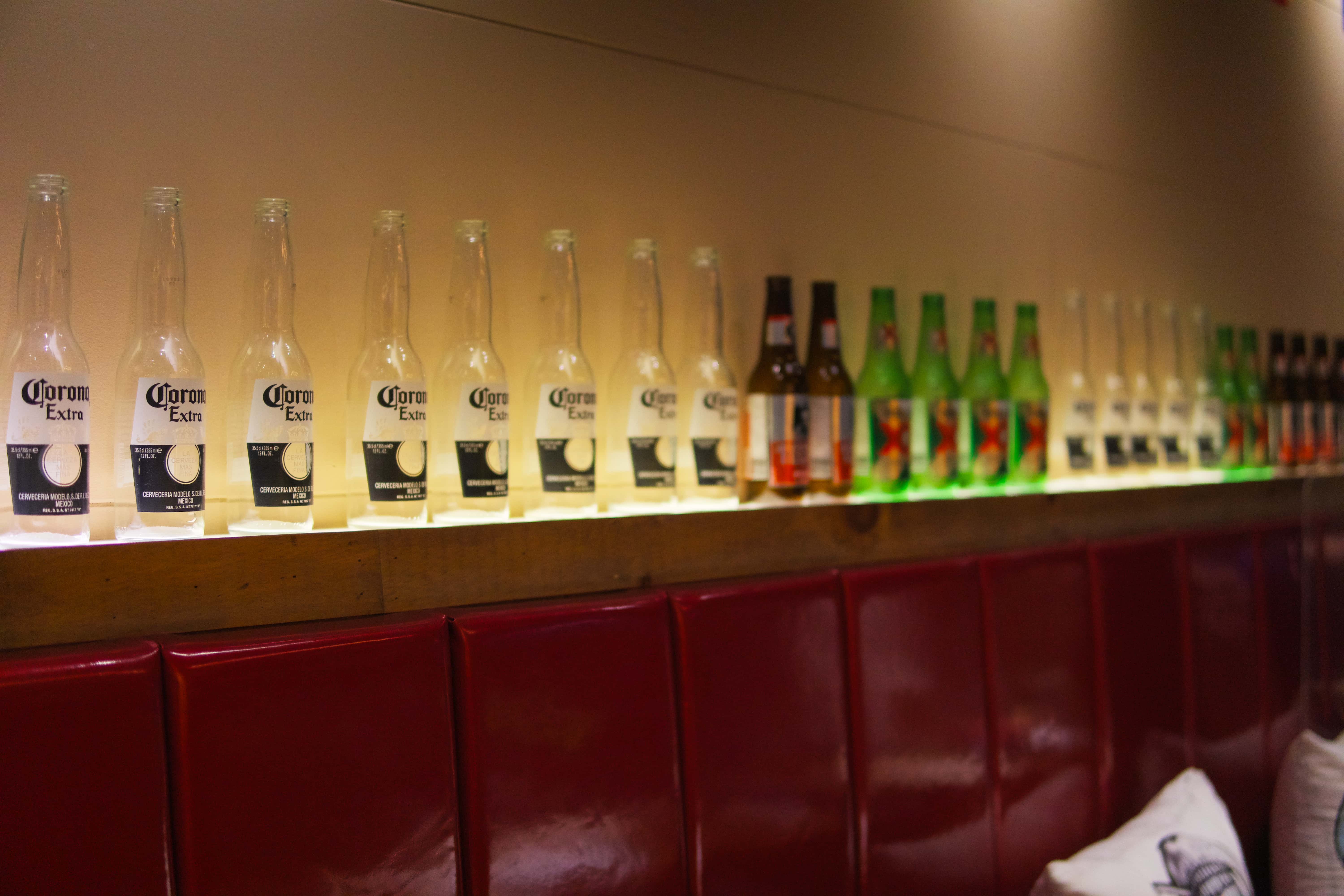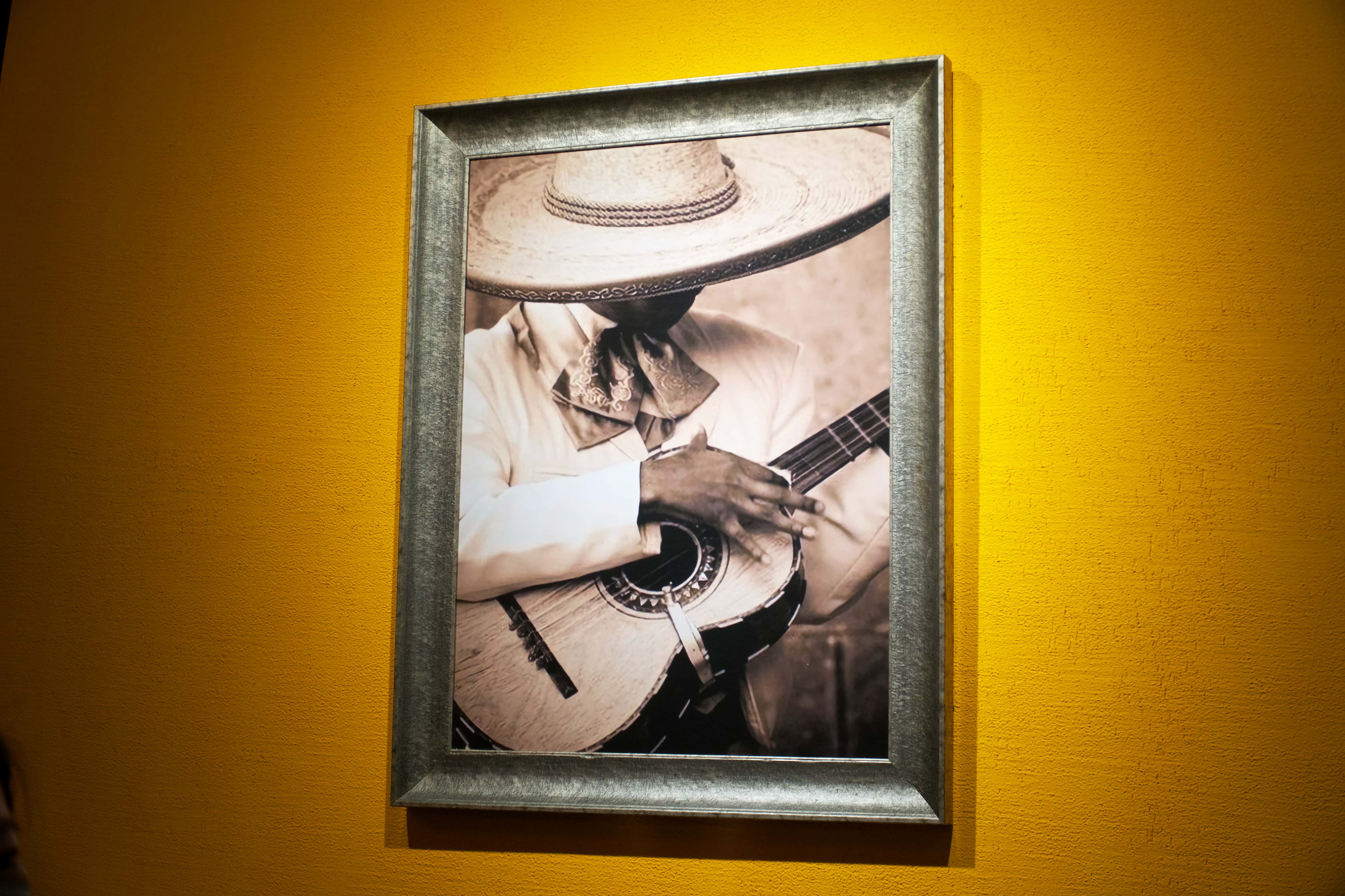 벽의 사진과 술병 그리고 스페인어는 멕시코 느낌을 풍기고 있네요.'