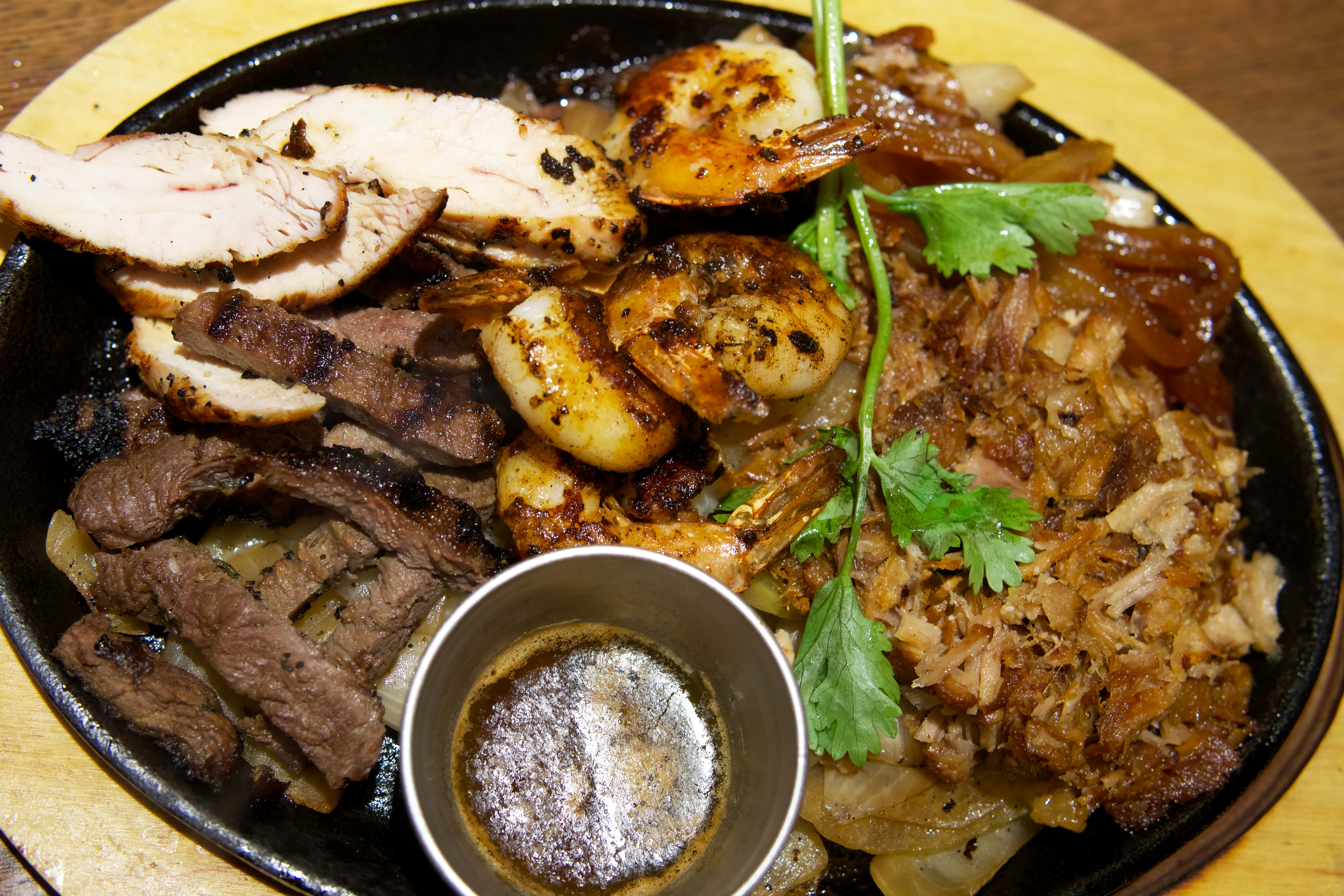 파히타 플래터에는 닭고기, 소고기, 돼지고기, 새우, 돼지 껍데기 무려 5종류의 고기가 나오고 밑에는 양파가 깔려 있습니다. 나올때 지글지글 하는 소리와 함께 기름이 튈 수 있으니 주의하세요!!